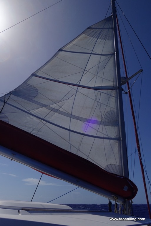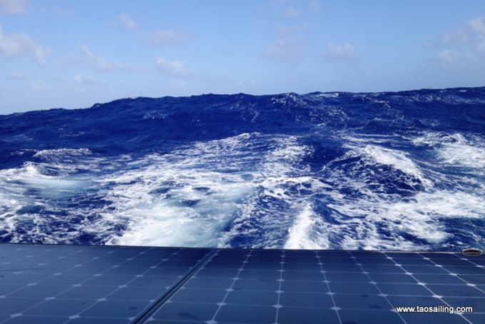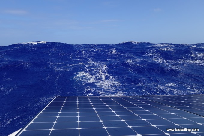Mais généralement tout se passe en douceur… Tao se fait porter par la vague puis part dans un long surf, sans trop perdre son cap. Nous devons quand même régler le pilote automatique sur une réponse plus rapide afin d’éviter les départs au lof ou les empannages. ![]()