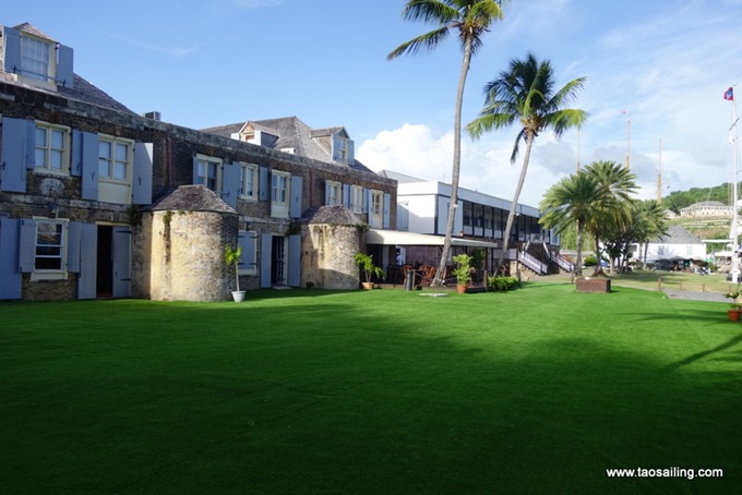 Les anciens bâtiments de Nelson’s Dockyard sont bien restaurés et tout y est “parfait” jusqu’à l’herbe synthétique… Presque aussi bien que Dysneyland!