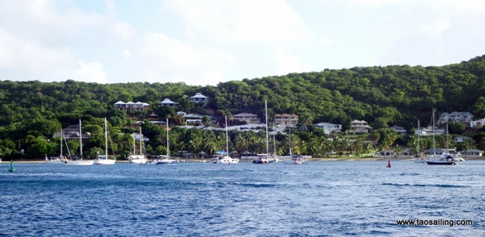 Nous trouvons une place bien tranquille juste derrière les récifs en entrant. Fond de sable de bonne tenue avec 3 mètres d’eau… Parfait! Mais pourquoi aucun autre bateau y a mis l’ancre? Ils sont tous serrés au centre de la baie avec leurs pare-battages à poste. ![]()