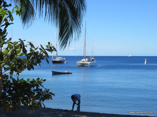 Nous nous dirigeons vers Saint Pierre, au nord ouest de la Martinique. Pas le temps d’explorer le sud… dommage! Face au village, Tao trouve une place assez près du rivage car les fonds descendent vite.![]()