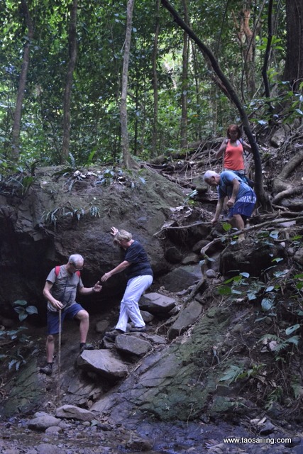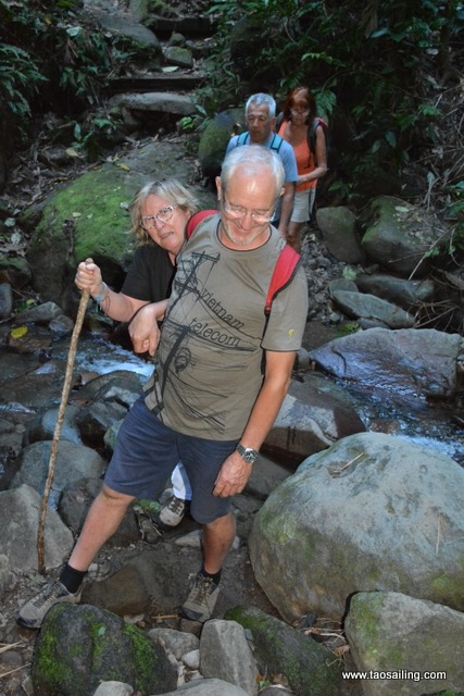 Petite randonnée dans la forêt tropicale au nord ouest de l’ile, jusqu’à la cascade de la rivière couleuvre. Le chemin est tortueux jonché de racines, boues et roches glissantes. La joyeuse bande garde le sourire…encore un dernier effort nous sommes presque arrivés à la cascade…
