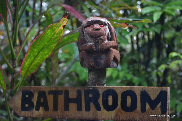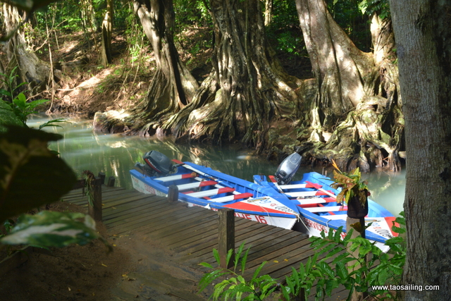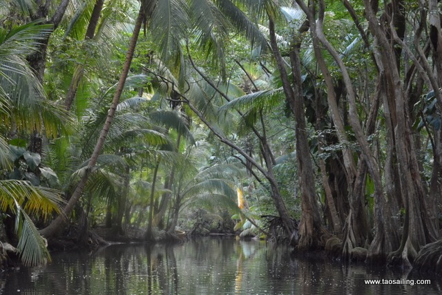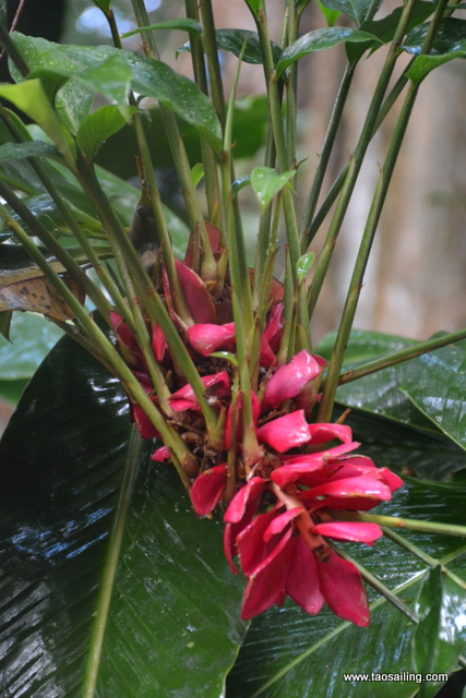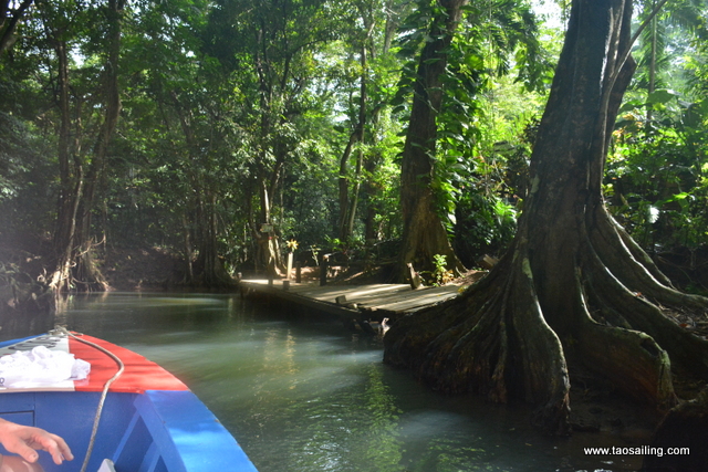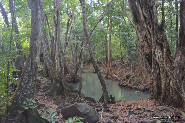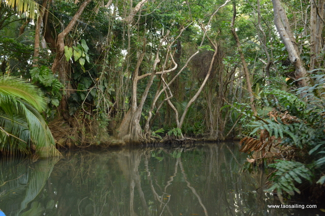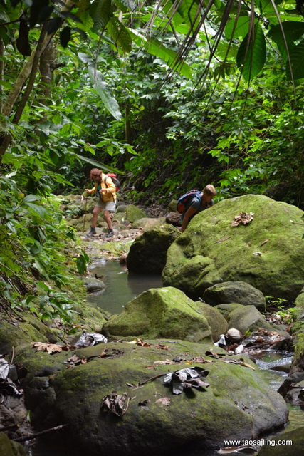 Nous remontons la rivière dans la forêt vierge… puis arrivés en haut, surprise !! Un local nous demande $US 10 par personne pour aller jusqu’à la cascade! Nous faisons demi-tour.