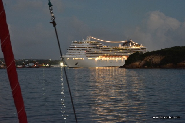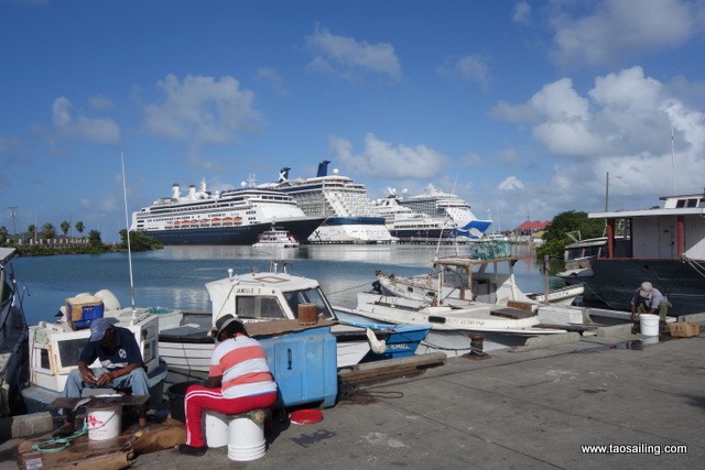 Nous devons aller à St Johns (port de commerce et capitale d’Antigua) pour y récupérer des équipements que nous avons fait venir par bateau de Miami. Le fond de la baie est barré par une série d’immeubles flottants!![]()