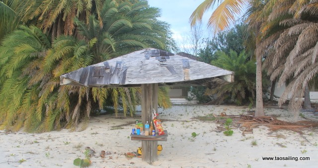 Nous déménageons quelques milles plus à l’ouest, où la protection est meilleure derrière Cocoa Point. Toute la pointe est privée, occupée par un hôtel et interdite d’accès. Quelques bateaux sont mouillés face à l’hôtel et nous longeons la côte en zigzaguant entre les patates de corail pour mouiller loin de tout le monde face à une plage déserte, une cocoteraie et des bungalows inoccupés.