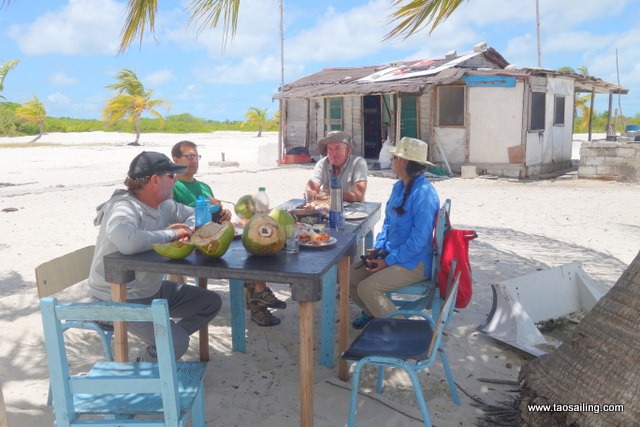 Ils nous invitent à venir manger à terre le lendemain et nous arrivons chargés de cadeaux: cordages, huile d’olive, pates… gâteau à la banane et une baguette fraichement sortie du four. Toutes des denrées très chères à Cuba ou même impossible à trouver. Nous leurs donnons également les quatre batteries au plomb qui ont moins de un an et ne nous servent plus – nous comprenons que chaque batterie vaut l’équivalent de six mois à un an de leur salaire! Ils ont installé une table sous les cocotiers dans un courant d’air… presque frais.