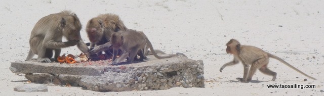Les singes gardent leur distance et se précipitent sur les restes de langouste.