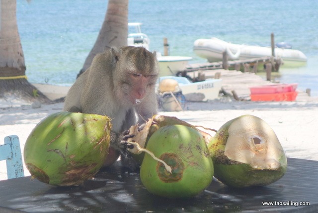 D’autres s’installent à table pour manger la pulpe des noix de coco fraiches.
