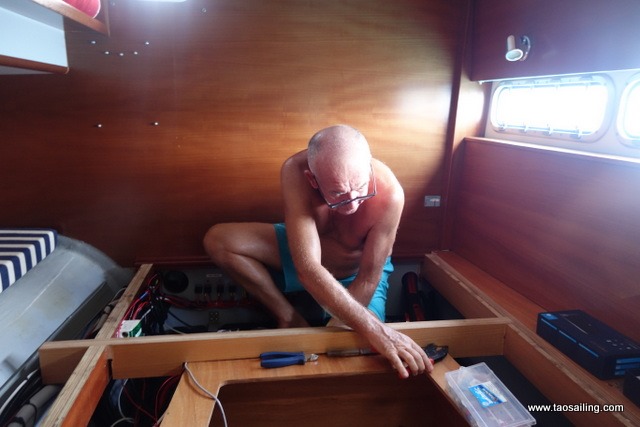 Les Cayman ont de bonnes liaisons directes avec les USA et nous en profitons pour commander un second pilote automatique en prévision de la traversée du Pacifique. En attendant qu’il soit livré, Philippe remplace certains câbles électriques pour en augmenter la section.