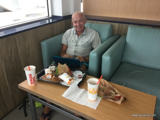 Après 5 semaines à Cuba et une cure de langoustes nous ne pouvons résister au Burger King en front de mer avec une vue sur la baie de George Town.![]()