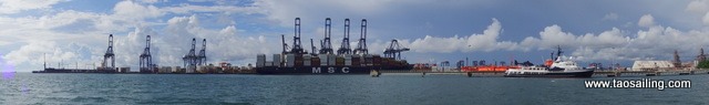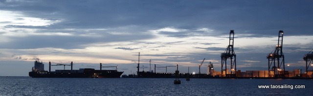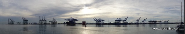Vue imprenable sur les quais et grues gigantesques. Premier rendez-vous au mouillage des “Flats” pour mesurer le bateau… mais le mesureur arrive avec deux jours de retard.