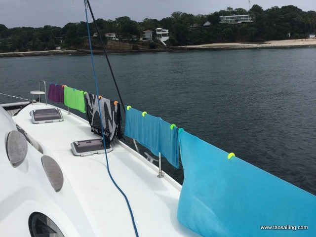 Formalités de sortie du Panama, plein de gasoil et en route pour les iles Las Perlas à 35 milles au large. Mouillage en face de l’île de Contadora où il y a une bonne connexion Internet. Trois jours de lessive nous attendent …