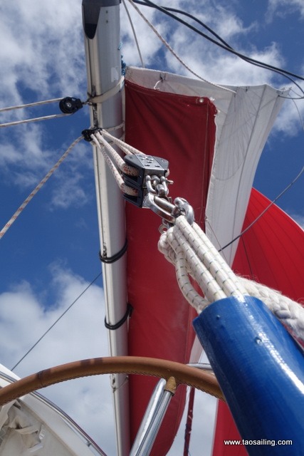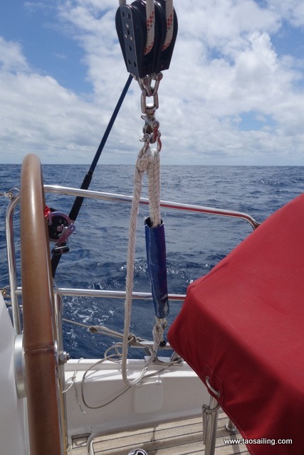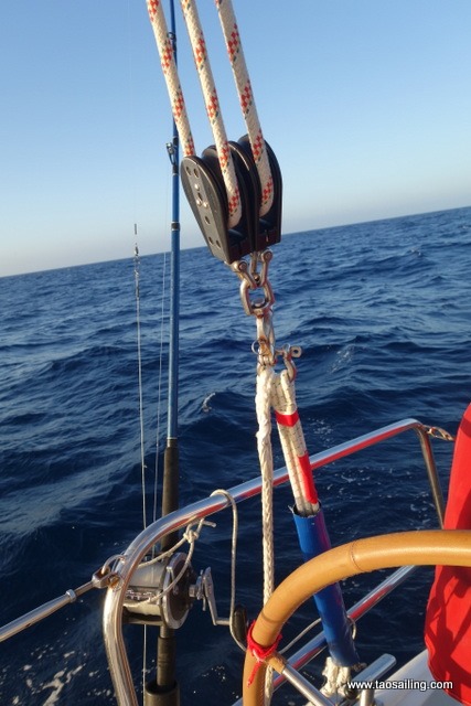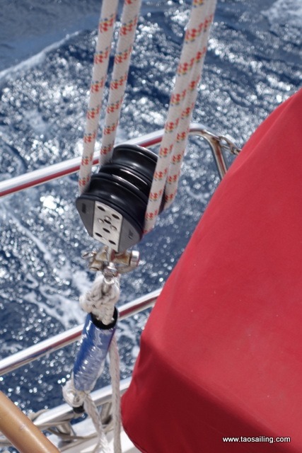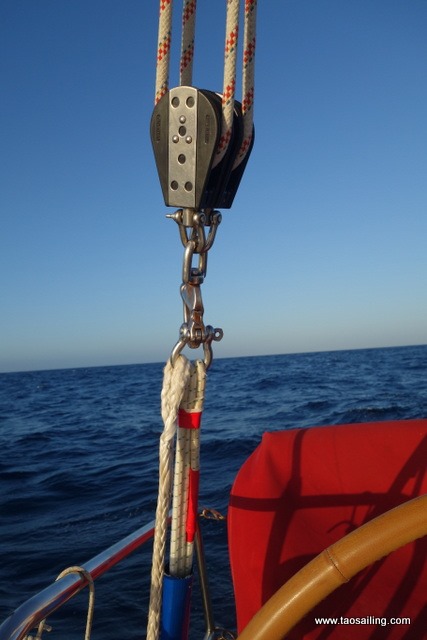 Venant du monocoque j’avais gardé l’habitude de mettre, sur Tao, un palan retenue de bôme par vent portant. Celui-ci était frappé entre le taquet central et un pontet aux 2/3 arrière de la bôme… jusqu’au jour où le taquet s’est arraché… et un copain a plié sa bôme avec la même technique!!! Comme on apprend par ses erreurs et surtout ce qu’elles nous coûtent, cela à déclenché une réflexion sur l’adaptation de cette technique pour un catamaran… qui n’encaisse pas les surventes et autres erreurs en gitant! Voici donc 6 mois que je navigue au portant avec un “Bungee” de bôme…