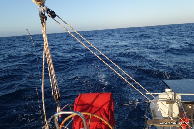 a) vent modéré et mer formée: la bôme a des soubresauts de bas en haut, et d’avant en arrière, ce qui est bruyant, mais surtout use prématurément le vit-de-mulet et toutes les pièces qui gigotent dans le processus.