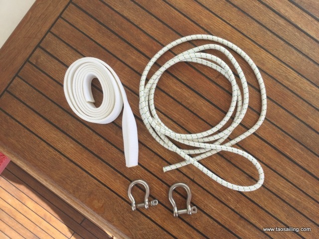 Un élastique pour amortir… et une estrope pour retenir la bôme. Donc plusieurs bouts élastique de fort diamètre (bungee) avec en parallèle une estrope en Dynema qui fait office de butée de sécurité. Celui-ci devra être frappé entre un taquet vers l’arrière du bateau et un pontet sécurisé (ou sangle) sur la bôme, le plus prêt possible du palan d’écoute.![]()