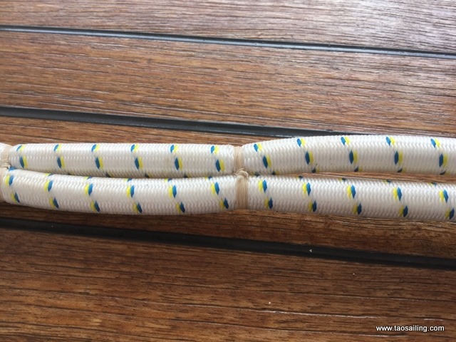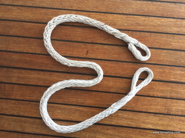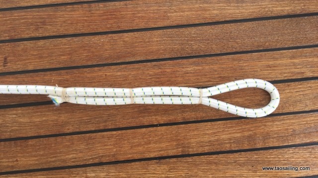 7) Confectionner une estrope en Dynema avec un œil à chaque extrémité pour avoir une distance entre “yeux” de 1,10 mètre (deux fois la longueur de l’élastique au repos).![]()