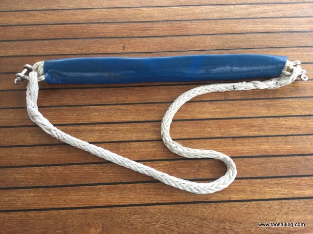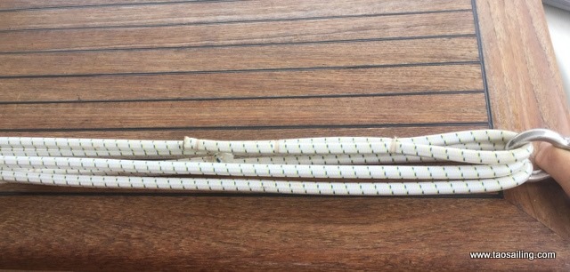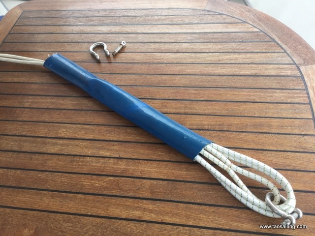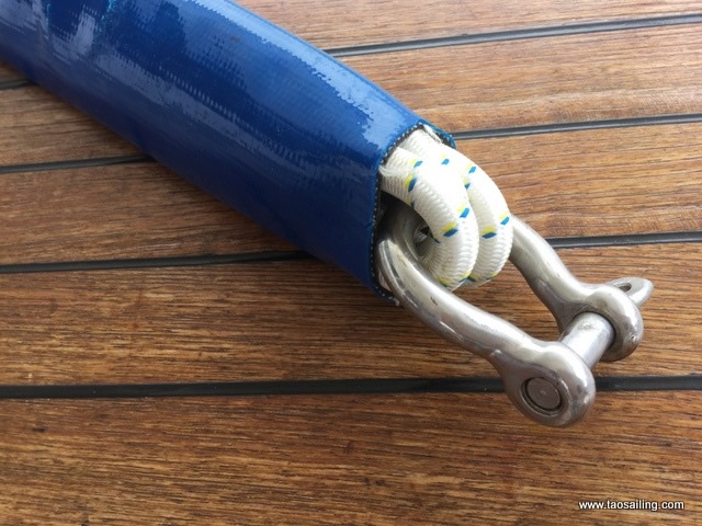 Suggestion : faire une manille textile à la place de la manille inox…. le projectile sera moins hard…. voir même mettre dans la boucle dyneema l’élastique, plus besoin de manille ! et accrochez direct dyneema sur palan de bome et taquet…..