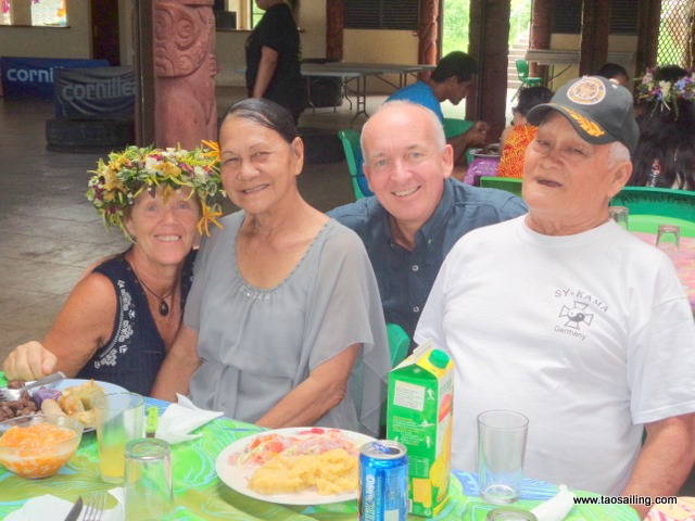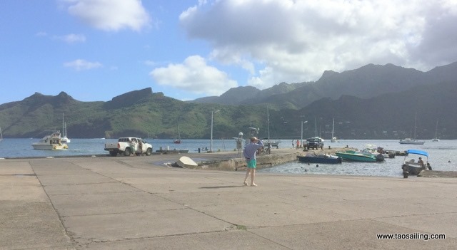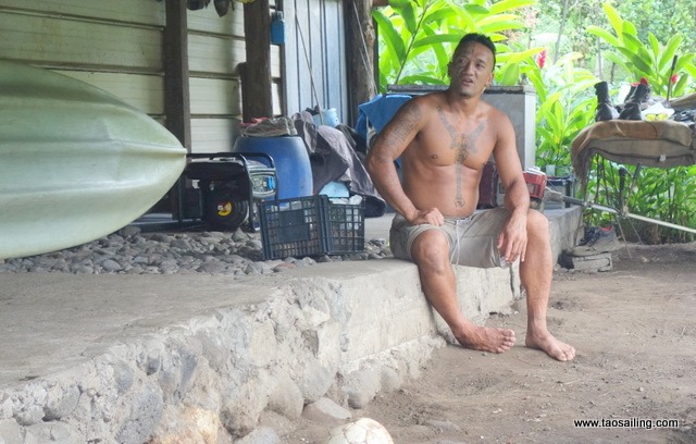 Mathias raconte toujours des tas d’histoire… parfois un peu difficiles à suivre avec son accent prononcé et son français entrecoupé de nombreux mots marquisiens… et on rigole bien! Le lendemain il vient nous chercher au “petit quai” pour nous inviter à manger avec eux dans une des baraques installées pour les fêtes de Juillet.![]()