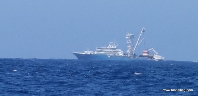 Nous croisons plusieurs bateaux de pêche industrielle à plus de 1500 miles des côtes les plus proches. Ils sillonnent la mer à la poursuite des bancs de thons… et rares sont ceux qui en réchappent!