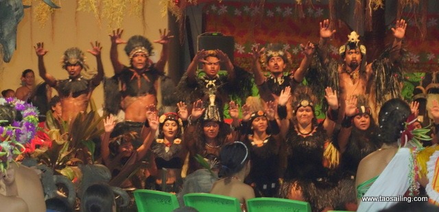 Ce sont les fêtes de Juillets en Polynésie (“Heïva”). Chaque vallée a son groupe de danse qui se prépare pendant plusieurs mois en vue de cette compétition. Ce soir le dernier groupe de danse fait sa représentation dans la salle communale et nous sautons sur l’opportunité pour nous replonger dans l’ambiance Marquisienne. ![]()
