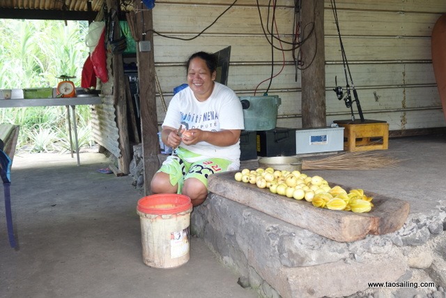 Kua et Teïki sont toujours dans leur maison et y vendent des légumes, des jus et sorbets de fruits, et proposent des repas traditionnels de produits locaux aux équipages et marcheurs de passage. ![]()