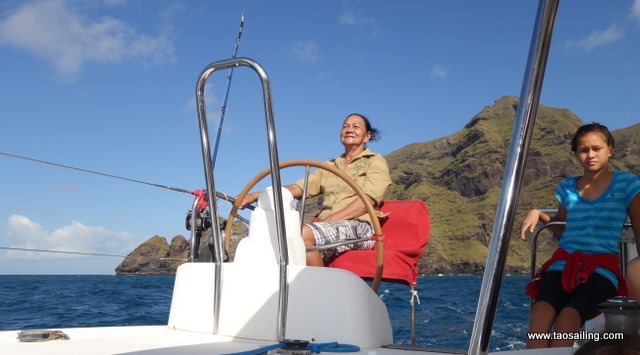 Nous sommes contents de les retrouver et tout de suite les conversations reprennent comme si nous ne les avions quittés hier. Ils profitent de notre retour sur Taiohae pour rentrer avec nous. Monette toujours sur le pont dans le vent et la forte houle. ![]()