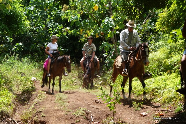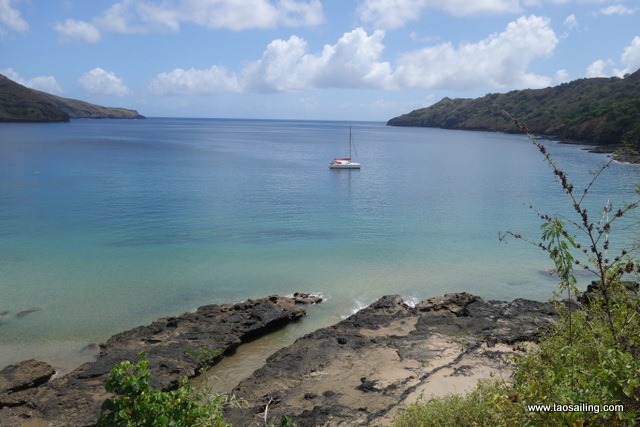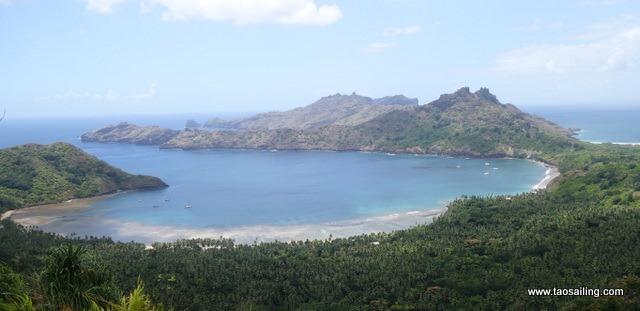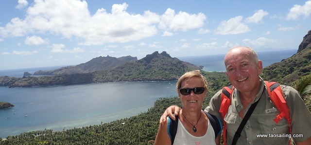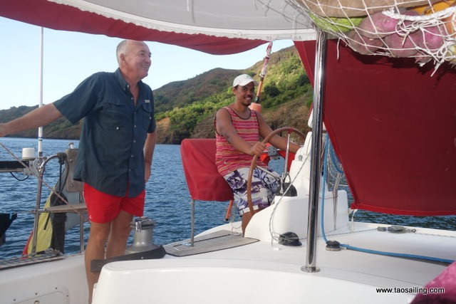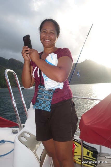 Laura s’occupe des plantations dans les “50 pas du roi” (la zone publique le long du littoral – le roi devait faire de grands pas car c’est une bande de 81 mètres de large tout autour de la baie de Anaho). Laura et Pakau nous rejoignent sur le bateau pour le déjeuner, c’est l’occasion de leur faire gouter le gâteau banane chocolat de Nathalie!![]()
