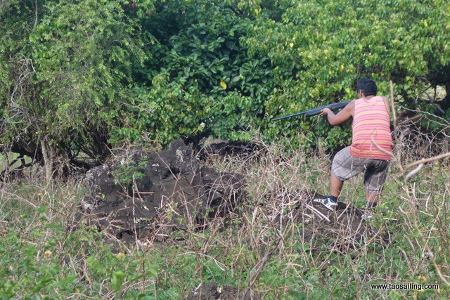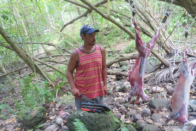 Nous passons deux semaines de “vacances” dans la baie de Anaho où nous sympathisons avec Laura et Pakau qui y habitent. Pakau propose d’emmener Philippe à la chasse à la chèvre…