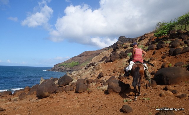 Un matin aux aurores, nous entendons quelqu’un siffler sur la plage. C’est Pakau avec un deuxième cheval en remorque. Il m’attend pour aller chasser la chèvre dans la montagne. En quelques minutes je suis prêt et le rejoins… Le cheval est docile et semble obéir, bien que je ne lui parle pas en Marquisien.![]()