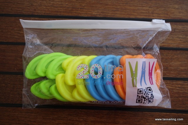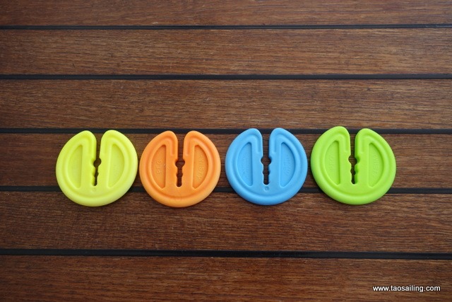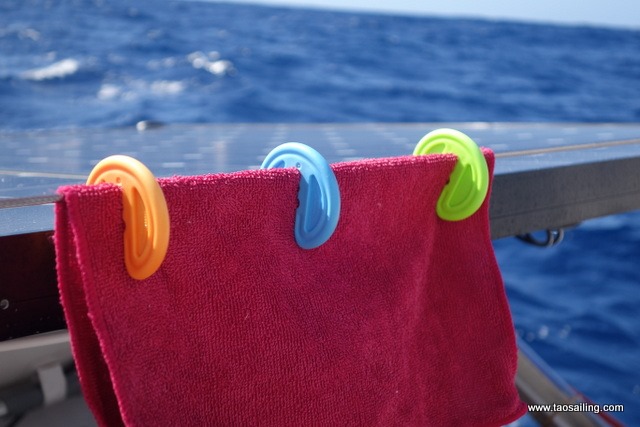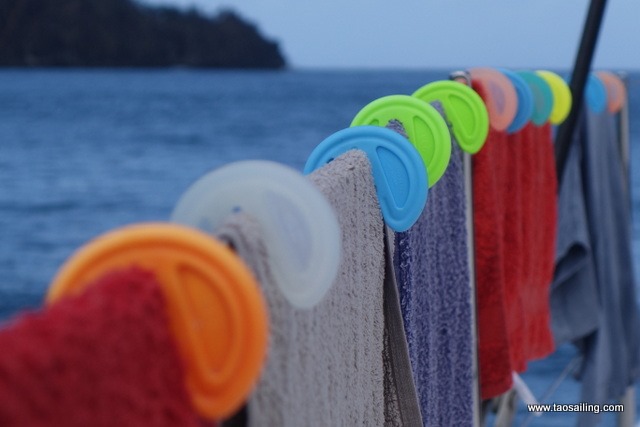 Bien pratiques ces pinces à linge sur un bateau… elle ne rouillent pas, flottent et tiennent parfaitement bien sur les filières même par fort vent. Il suffit de bien les clipser.![]()
