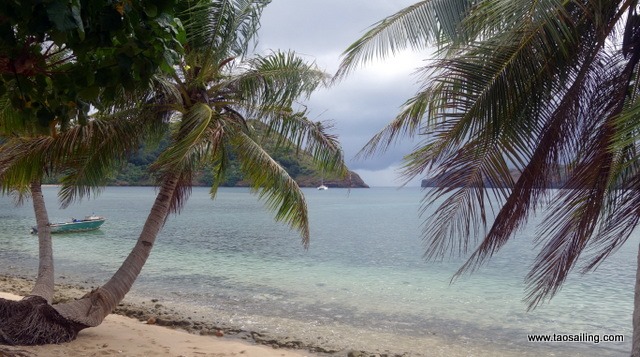 Le fond de la baie est bien encombré de têtes de corail et nous avons du mal à trouver un coin de sable. Enfin nous voici bien accrochés sans que la chaine abime ces coraux fragiles. Nous explorons les baies voisines en annexe et discutons avec Johnny qui, en fin de journée, casse des cocos pour ses cochons. Les moustiques et nonos en profitent pour un bon repas sur nos chevilles. ![]()