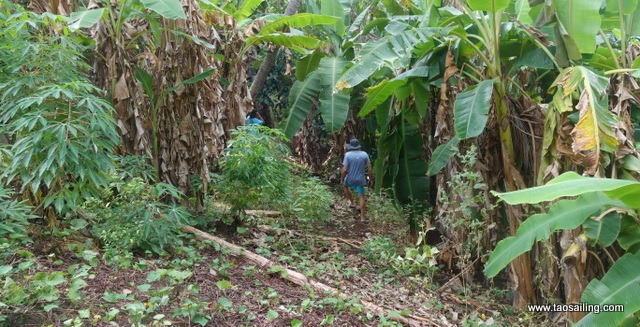 Nous rencontrons Laura qui nous propose d’aller chercher un régime de bananes. Nous voici partis dans la bananeraie à la recherche d’un petit régime bien mur.![]()