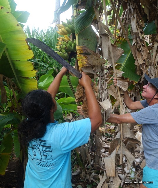 Voilà, nous l’avons trouvé. Laura coupe l’arbre délicatement afin de ne pas faire tomber les bananes déjà bien jaunes.![]()