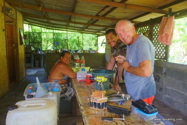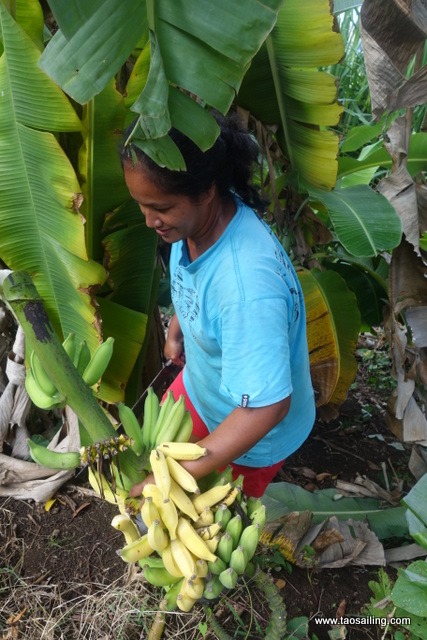 Ce jour là, sans avoir rien demandé, nous rentrons à bord avec des bananes, des papayes, des concombres et du gingembre… Quelle générosité! Le lendemain nous lui apportons un cake à la banane et papaye… qui arrive juste à temps pour leur pose de la matinée.![]()