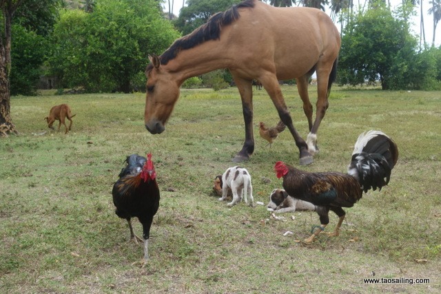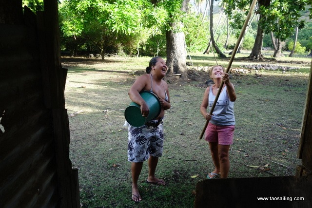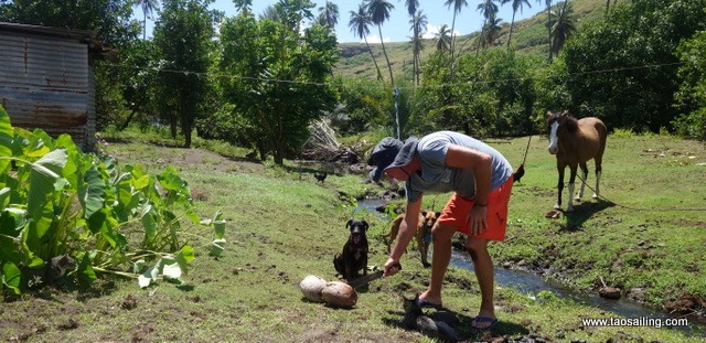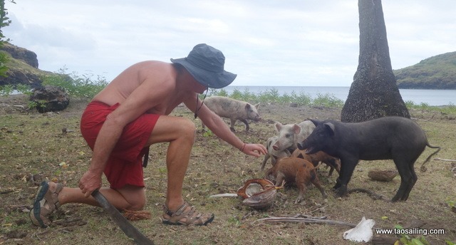 Retour dans la vallée de Pua. C’est le weekend… Marina et Germain sont au village. Aussitôt le pied sur la plage leurs cochons nous accueillent bruyamment. Philippe leur casse quelques cocos à la machette et nous sommes vite “copains”.![]()