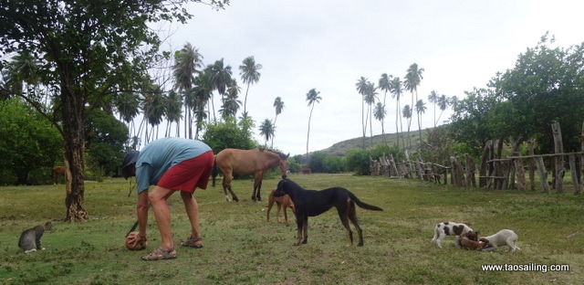Et là, après quelques aboiements peu convaincants, toute la ménagerie nous fait comprendre qu’ils ont faim. Quelques cocos feront l’affaire…![]()