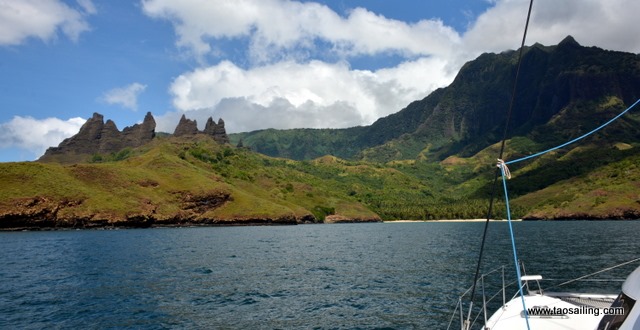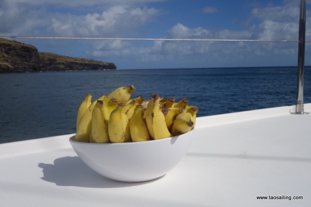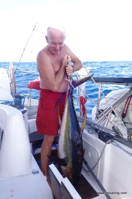 Alors que nous quittons l’île de Eiao, un thon jaune de 25+ kilos mord sur l’une des lignes. C’est une belle bataille pour le remonter à bord et vite le congélateur est plein. Le soir même nous nous arrêtons à Hakaehu pour en donner un morceau à Germain et Marina.![]()