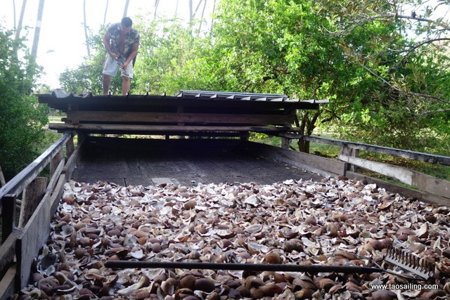 Ensemble nous ramassons les cocos pour le copra et je donne un coup de main pour remplacer quelques tôle sur le séchoir à copra.![]()