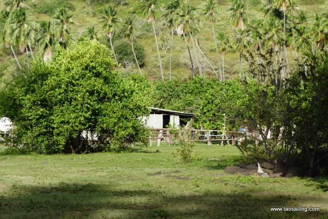 La baie de Vaituha est cartographiée, bien protégée malgré les quelques rafales quand le vent forcit. Mais nous sommes bien accrochés sur le fond de sable et vase. Déjà nous entendons les moutons bêler. En effet l’île est réputée pour ses moutons sauvages que les habitants de Nuku Hiva viennent chasser régulièrement. A terre un semblant d’embarcadère et un abri pour les chasseurs. ![]()
