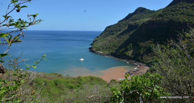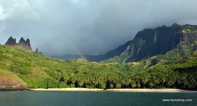 Nous continuons vers l’ouest jusqu’à une baie que nous avait indiquée Henry (snack sur le Petit Quai de Taiohae). Une baie calme avec plage de sable blanc au pied des falaises et autres pitons.![]()