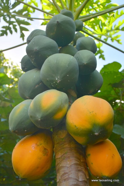 Les chasseurs ont planté quelques papayers qui donnent bien. Comme il n’y a personne sur l’île nous nous servons avant qu’elles ne pourrissent ou soient mangées par les oiseaux.![]()