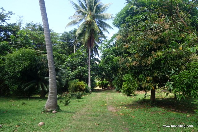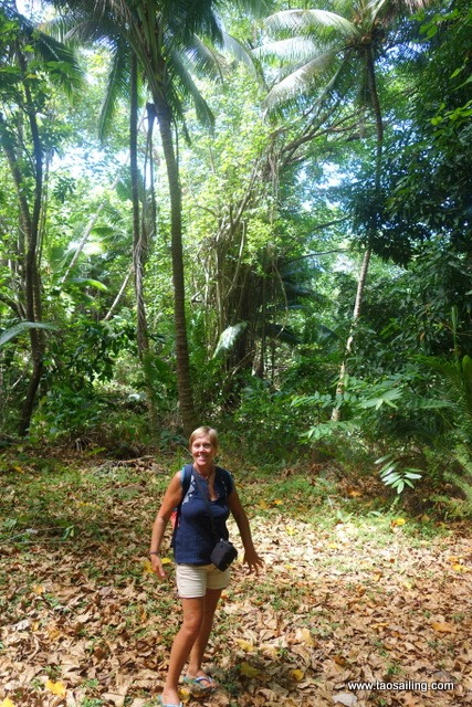 L’arboretum que l’ancien maire “Léon” a créé se trouve à 5 kms du village. Il est réputé dans toute la Polynésie pour sa diversité de plantes locales et importées. Nous prévoyons beaucoup d’eau et quelques bananes séchées au cas où personne ne nous prendrait en stop. La première voiture qui passe nous emmène jusqu’au jardin dans une vallée entre les anciens volcans. 3 employés entretiennent quotidiennement le site.![]()