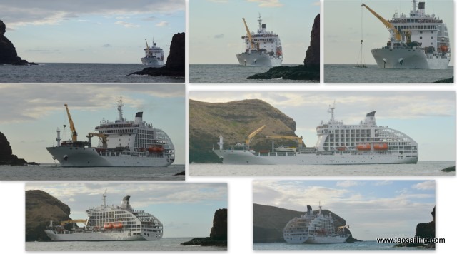 Comme prévu, le lendemain matin l’Aranui” se pointe à l’entrée de la baie de Vaipaee. Comment va t’il pouvoir entrer dans ce goulet étroit? D’abord nous entendons l’ancre qui descend dans un grondement de ferraille, puis le cargo se positionne en travers de la baie… avant de terminer son demi-tour. Deux barges sont mises à l’eau pour aller fixer des amarres de chaque côté de la baie. Voilà nous ne pouvons plus sortir de la baie! ![]()