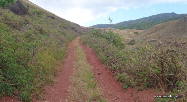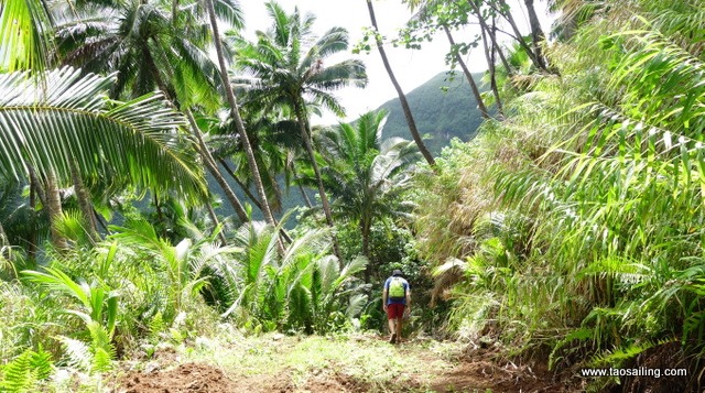 Nous assistons du bateau à toute cette agitation et finissons par aller à terre pour nous dégourdir les jambes jusqu’à la baie suivante inaccessible par la route. Grace aux cartes Navionics “Hike and Bike” que nous avions téléchargé, nous avons repéré une balade de 14 kms à faire jusqu’à la baie de Haavei. Le sentier monte progressivement ![]()