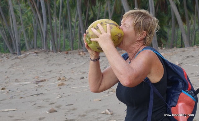 En chemin nous croisons quelques chèvres absolument pas apeurées par notre présence, puis quelques maisons isolées avant de rejoindre une vallée verdoyante. Le ciel s’assombrit et c’est quand nous arrivons aux abords de la plage qu’il commence à pleuvoir. Nous avons juste le temps de nous rafraichir avec une coco et… ![]()