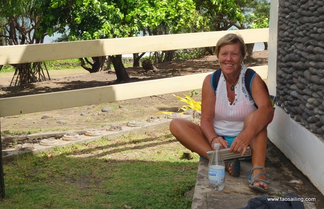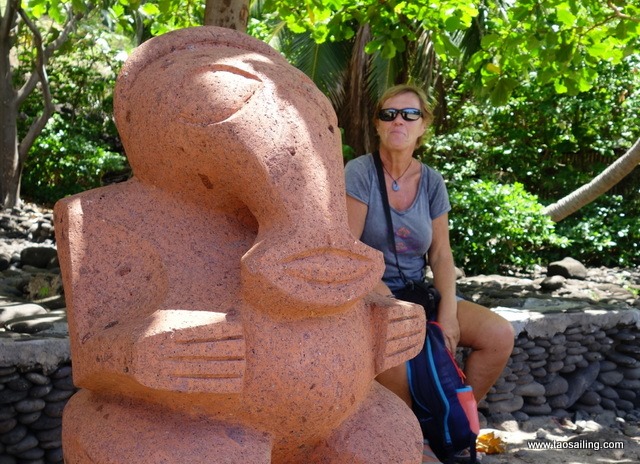 Nous faisons un rapide tour au musée de la pierre avec une réplique du “Tiki Baleine” à l’entrée. La légende dit que ce Tiki (qui n’a été trouvé qu’a Ua-Huka) était attaché à l’avant des barques de pêche et que lorsque celui-ci se détachait et tombait à l’eau c’était le bon endroit pour pêcher… de retour au village les barques étaient chargées de poissons, et le “Tiki Baleine” était déjà revenu chez lui! Nous en avons acheté un en bois de rose… et trois jours plus tard nous avons pris un thazard de plus de 1,50m! Le congélateur est plein, merci Tiki-Baleine.![]()