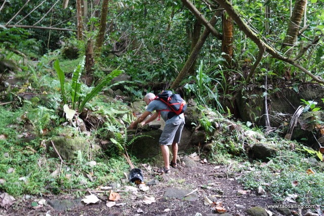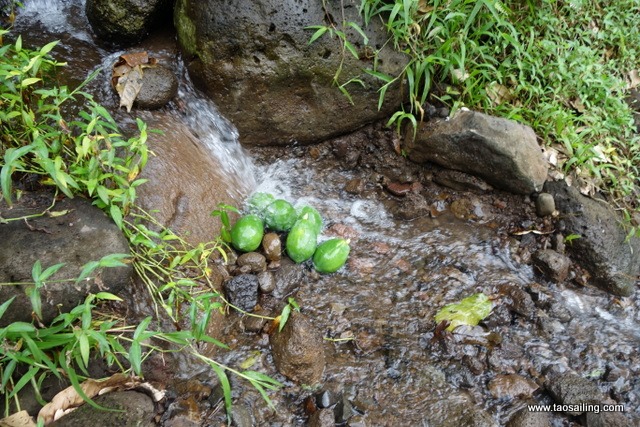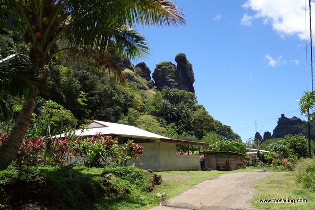 En chemin nous croisons les habitants et chacun nous demande: “Qu’est ce que tu as à échanger sur ton bateau; cordages, leurres, vêtements…?” Un peu pris au dépourvu et surtout pas habitués à ce genre de “commerce” en Polynésie, nous passons en revue ce que l’on a pour leur faire plaisir. C’est un ciré pratiquement neuf que nous donnons à Christian. Il nous propose des Tikis et autres sculptures, mais nous n’attendons rien en échange. Il insiste et repartons avec quelques pamplemousses de son jardin. ![]()