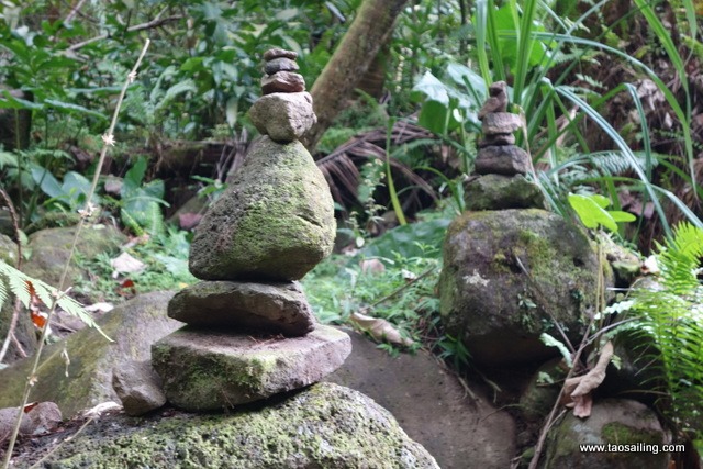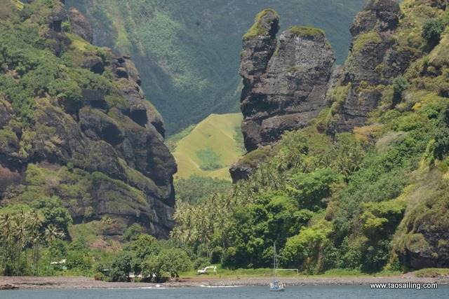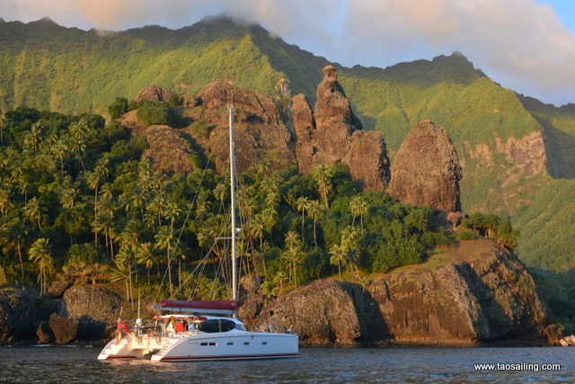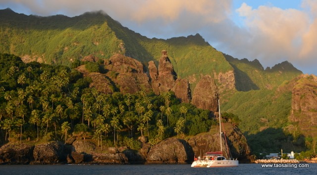 La météo est favorable pour rejoindre l’ile de Fatu hiva. Un vent constant de 15 nœuds nous emmène jusqu’à la baie de Hanavave, dont l’entrée n’est pas facile à identifier du large. Déjà Nathalie s’active sur le pont! Et oui chacun son rôle sur le bateau, pendant que l’un est à la barre l’autre remet de l’ordre dans les cordages et prépare le mouillage.![]()