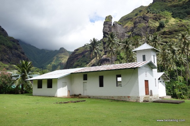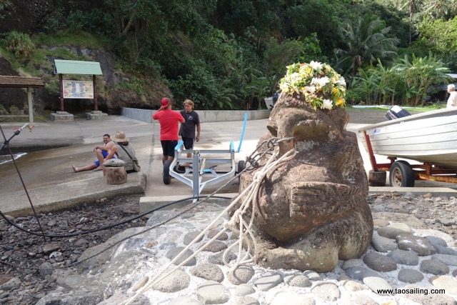 Une petite table d’artisanat est installée avec quelques sculptures en bois et tapas (écorce de bois peinte). Les touristes ne se précipitent pas dessus, les prix pratiqués sont plus chers que dans toutes les iles des Marquises.![]()