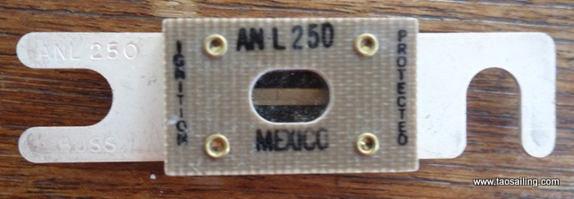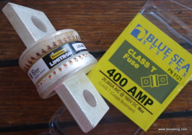 Un fusible « Class T » a une capacité de coupure de 20 kA et me semble être un meilleur choix.Le fusible doit être dimensionner de façon à avoir de la marge si plusieurs gros consommateurs fonctionnement en même temps (guindeau, winch électrique, desalinateur, convertisseur…). Pour mon application j’ai installé un fusible « Class T » de 400A.