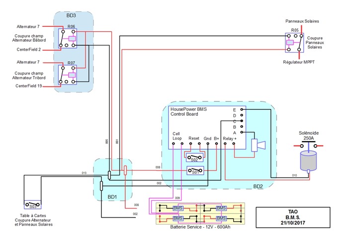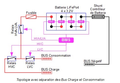 Le BMS va piloter des relais correctement dimensionnés pour couper les divers circuits de charge (HVC), de consommation (LVC) et aussi pour isoler la batterie en dernier recourt (HVA et LVA). La topologie « plat de spaghetti » que l’on trouve sur de nombreux voilier n’est pas toujours la plus appropriée pour une installation efficace du BMS.